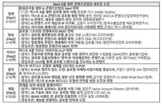 정책, 방송, 이야기(스토리), 음악, 게임 5개 분야에 걸쳐 전문가 28명이 참여한다. 각 장르별 글로벌 시장에서의 경쟁력 강화 방안, 초현지화 전략, 플랫폼 비즈니스 모델 혁신 등 K-콘텐츠의 새로운 도약을 위해 심도 있는 논의를 펼칠 예정이다.
