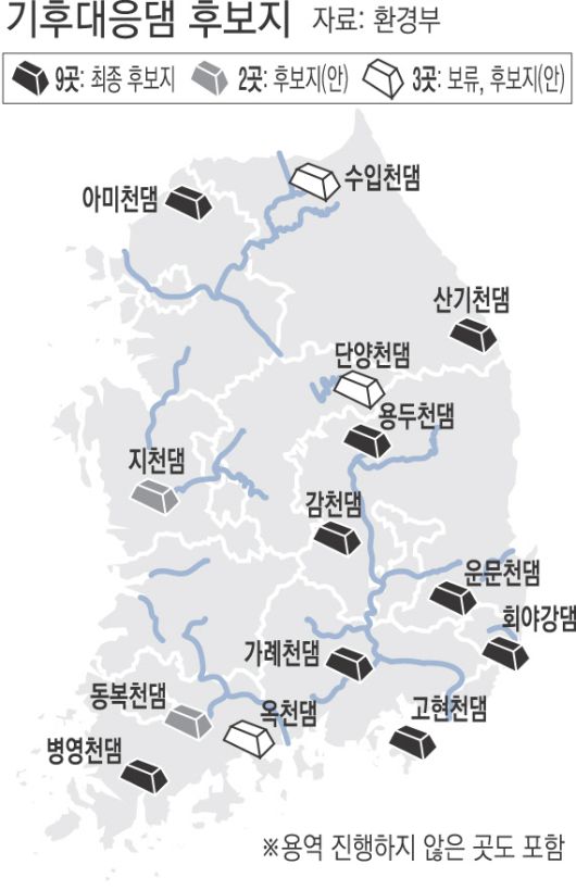 이재명 대통령이 조건부 신규 댐 설치 추진 폐기를 공약하며 윤석열 정부가 추진한 ‘기후대응댐’ 건설의 앞날에 관심이 쏠린다. 정부는 최종 후보지 9곳 외에 예비 후보지 1곳까지 기본구상 용역 절차를 밟고 있다.