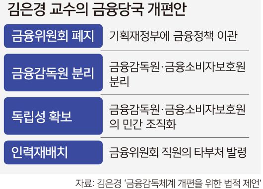 그는 논문에서 “금융정책과 금융 감독 권한이 금융위원회에 집중돼 있다”며 “금융위를 해체해야 한다”고 주장했다. 현재는 금융위가 금융산업·감독정책을 총괄하고 금감원이 이를 집행하는 구조인데 사정이 이렇다 보니 금감원이 정권의 입맛에 좌우될 수밖에 없다는 것이다. 김 교수는 금융위의 금융정책 독점이 금융 관료 카르텔화와 관치 금융으로 이어졌다고도 보고 있다.