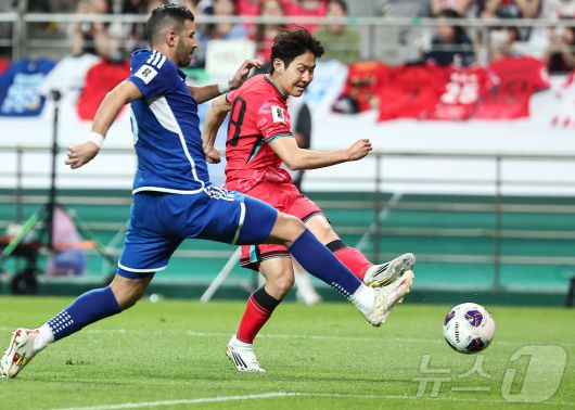 (서울=뉴스1) 김도우 기자 = 10일 오후 서울 마포구 상암동 서울월드컵경기장에서 열린 2026 국제축구연맹(FIFA) 북중미 월드컵 아시아 3차 예선 B조 10차전 대한민국과 쿠웨이트의 경기, 대한민국 이강인이 팀의 두 번째 골을 넣고 있다. 2025.6.10/뉴스1