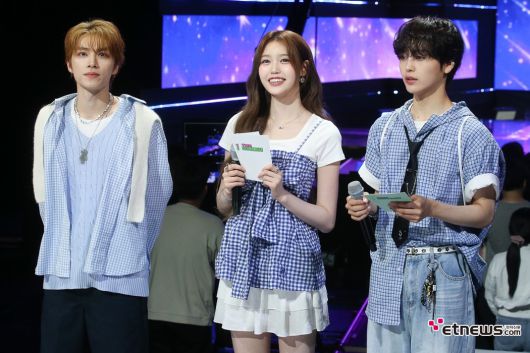 웨이션브이 샤오쥔, 이즈나 세비, 크래비티 형준이 10일 서울 상암동 SBS프리즘타워에서 진행된SBS funE ‘더 쇼’ 현장 미디어 공개 일정에 참석해 MC를 보고 있다. 전자신문인터넷 이승훈 기자 (mozart1205@etnews.com) [Copyright © 전자신문. 무단전재-재배포금지]