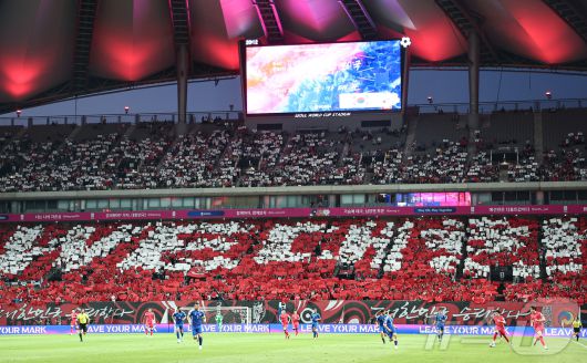 10일 오후 서울 마포구 상암동 서울월드컵경기장에서 열린 2026 국제축구연맹(FIFA) 북중미 월드컵 아시아 3차 예선 B조 10차전 대한민국과 쿠웨이트의 경기, 관중들이 11회 연속 월드컵 본선 진출을 자축하는 카드섹션을 하고 있다. 2025.6.10/뉴스1 ⓒ News1 김도우 기자 |