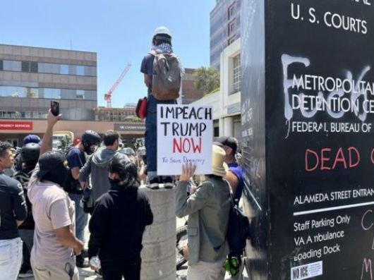 LA 도심 구금시설 앞에서 불법이민 단속에 항의하는 시위대. 연합뉴스 |