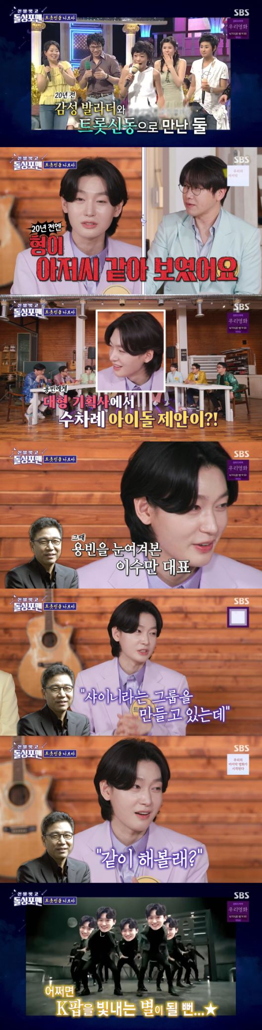 이때 춘길은 "용빈이와 '도전 1000곡' 왕중왕전에서 만난 사이"라고 했다. 당시 모세로 활동 중이었던 춘길과 14살이었던 김용빈의 모습이 자료화면으로 등장해 눈길을 끌었다.