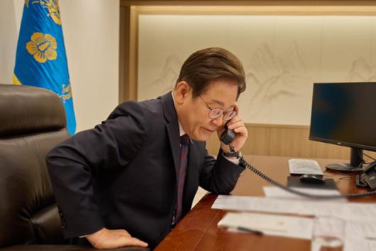 이재명 대통령이 10일 용산 대통령실에서 시진핑 중국 국가주석과 전화 통화를 하고 있다. 이 대통령의 해외 정상과의 통화는 도널드 트럼프 미국 대통령, 이시바 시게루 일본 총리에 이어 세 번째다. 대통령실 제공 |