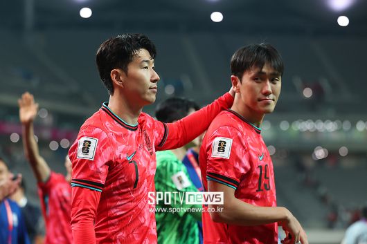[스포티비뉴스=서울, 곽혜미 기자] 2026 FIFA 북중미 월드컵 아시아 3차 예선 대한민국과 쿠웨이트의 경기가 10일 오후 서울월드컵경기장에서 열렸다. 4-0으로 승리한 손흥민이 원두재와 함께 팬들에게 인사를 하고 있다. <저작권자 ⓒ SPOTV NEWS. 무단전재 및 재배포 금지>