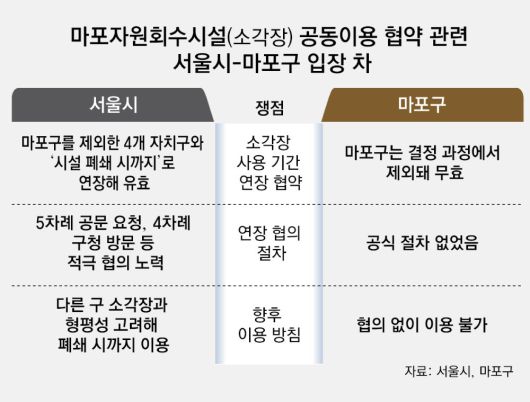 서울시는 기존 협약의 만료일이던 지난달 31일을 앞두고 마포구를 제외한 나머지 4개 자치구와 공동 이용 연장 협약을 체결했다. 시는 “폐기물관리법과 관련 조례를 준수해 자치구들과 협의를 적법하게 진행했다”는 입장이다. 폐기물관리법 제5조 제1항에 따르면 마포자원회수시설은 서울시가 설치한 광역폐기물처리시설로, 소유권은 서울시에 있다. 시 관계자는 “마포구는 소각장이 위치한 자치구일 뿐, 소유·운영 권한은 서울시에 있다”며 “양천, 강남, 노원 등 다른 3개 소각장도 ‘시설 폐쇄 시’까지 공동 이용하는 협약을 맺었기 때문에 형평성 차원에서 마포 시설도 같은 기준으로 연장한 것”이라고 설명했다.