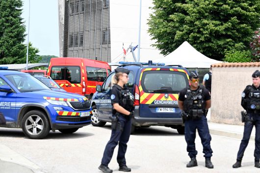 프랑스 군경찰이 10일 프랑스 동부 노장트의 프랑수와즈 돌토 중학교 앞에서 일반인들의 접근을 막고 있다. 이날 오전 이곳에서 가방 검사를 받던 이 학교 학생(15)이 교육 보조원을 흉기로 찔러 살해하는 사건이 벌어졌다. /AFP 연합뉴스 |