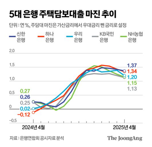 5대 은행, 주담대 원가 하락 할 때, 마진 되레 올려