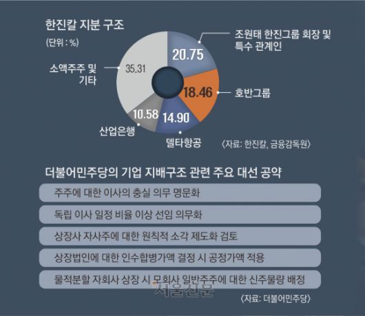 한진그룹이 더불어민주당의 상법 개정안 입법화를 앞두고 기습적으로 자사주를 조원태 회장의 지배력 강화에 이용해 비난을 사고 있다.