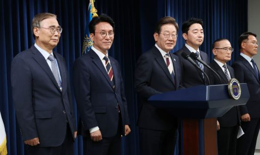이재명 대통령이 4일 서울 용산 대통령실청사에서 국무총리 후보자 등 인선에 대해 발표하고 있다. 왼쪽부터 이종석 국가정보원장 후보자, 김민석 국무총리 후보자, 이 대통령, 강훈식 비서실장, 위성락 안보실장, 황인권 경호처장. 대통령실사진기자단