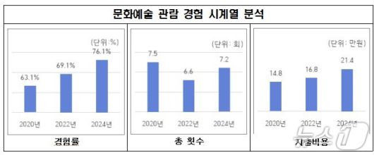 서울시민의 문화예술 관람률은 2018년 75.6%, 2020년 63.1%, 2022년 69.1%, 2024년 76.1%로 팬데믹 이전 수준을 회복했다. 지난 1년간 오프라인 문화예술관람을 경험한 서울시민은 평균 21만4000원의 문화비를 지출했고 연간 7.2회 정도 문화관람을 하는 것으로 나타났다.