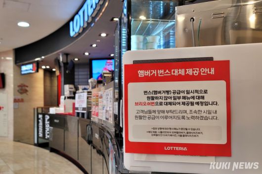 10일 서울의 한 롯데리아 매장에 햄버거빵 대체 제공 안내문이 붙어 있다. 김건주 기자 |