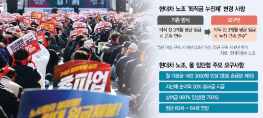 현대차 노조는 또 정년을 기존 60세에서 64세로 연장하는 방안도 이번 임단협 협상에서 요구한다. 연차별로 임금이 높아지는 현행 호봉제를 개편하지 않고 정년 연장에 나설 경우 현대차의 인건비 부담은 급증할 수밖에 없고 청년 채용은 축소될 것이 명약관화하다.