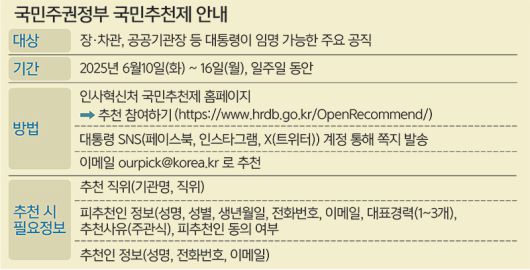 이재명 대통령은 이날 자신의 사회관계망서비스(SNS)에 ‘국민과 함께 국민주권정부의 문을 엽니다’라는 제목의 글을 통해 국민추천제를 실시한다고 했다. 이 대통령은 “진정한 민주주의는 국민이 주인이 되어 직접 참여하고 변화를 만들어가는 데서 시작한다“며 “국민 여러분께서 진짜 대한민국을 이끌어갈 일꾼을 선택해달라”고 밝혔다.