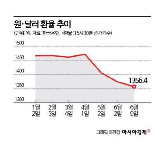서울외환시장에서 원·달러 환율은 10일 주간거래 종가 기준 1364.3원에 거래됐다. 지난 4월 초 1480원대 중반까지 치솟았던 원·달러 환율은 두 달 사이에 120원가량 하락하면서 안정세를 보이는 중이다.