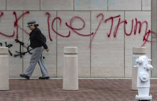 LA의 연방 정부 건물 벽에 트럼프 대통령을 비난하는 낙서가 그려져 있다. AP연합뉴스 |