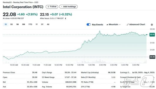 10일(현지시간) 뉴욕증시에서 인텔은 7.81% 급등한 22.08달러를 기록했다.