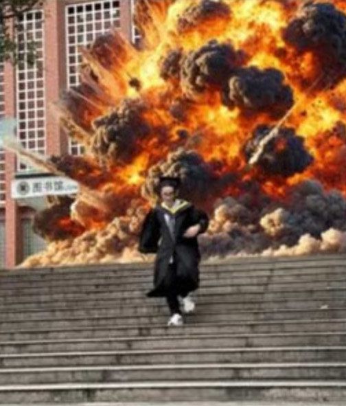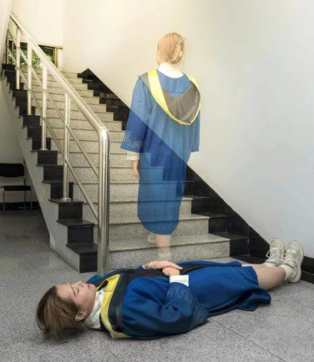 온라인에 공유된 사진을 보면 졸업생이 자기 머리를 들고 있거나, 몸에서 영혼이 빠져나간 모습, 폭발하는 학교에서 탈출하는 모습 등이 담겨있다.