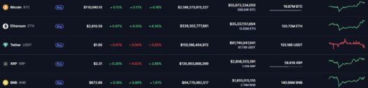 11일 글로벌 가상자산 시황중계 사이트 코인마켓캡에 따르면 이날 오전 7시 11분 기준 비트코인 가격은 24시간 전 대비 0.15% 오른 11만 90달러를 기록했다. 일주일 전과 비교하면 4.18% 상승했다. 알트코인(비트코인 외 가상자산)의 대표격인 이더리움은 전일 대비 6.1% 오른 2810달러에 거래됐다.