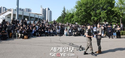 그룹 방탄소년단 정국(사진 왼쪽)과 지민이 11일 오전 경기 연천군 연천읍 연천공설운동장에서 진행된 전역 행사에 참석해 취재진의 질문에 답하고 있다. 진과 제이홉은 지난해, RM과 뷔는 전날 병역의 의무를 마쳤으며, 사회복무요원으로 복무 중인 슈가는 오는 21일 소집해제를 앞두고 있다. 한윤종 기자 hyj0709@segye.com ⓒ 세상을 보는 눈, 세계일보