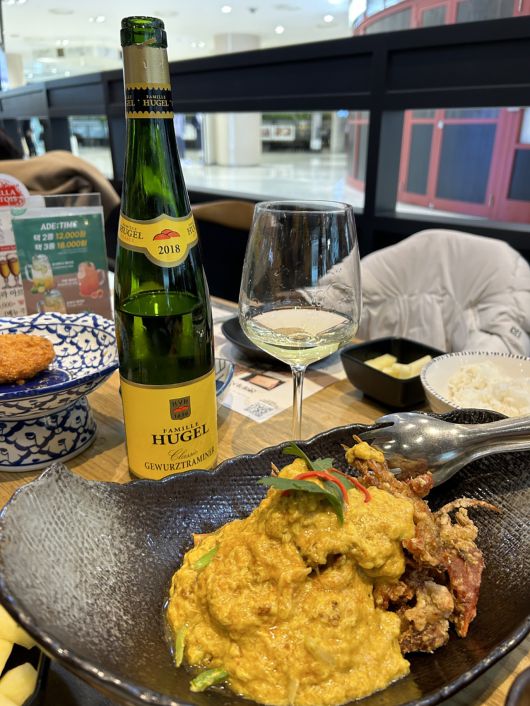 와인과 만나 침이 가득 고인 구강이 어서 빨리 음식을 투척하라고 재촉한다. 마침 와인과 비슷한 색을 띤 푸팟퐁커리가 눈앞에 먹음직스럽게 놓여있다. 바삭바삭 아삭아삭 튀겨진 작은 게를 집어 들어서 연노랑 커리에 푹 담가 웅덩이 물처럼 고여 있는 침 위에 덩그러니 올려놓았다. 와우! 부드러운 튀김옷 안에는 치아가 약한 어린아이도 무리 없이 씹어댈 수준의 앙증맞은 바삭함이 숨어 있다. 커리 특유의 향신료 향이 게뷔르츠트라미너의 개성 있는 타닌, 매캐한 연기 향, 은은한 단맛과 끝내주게 어우러진다.