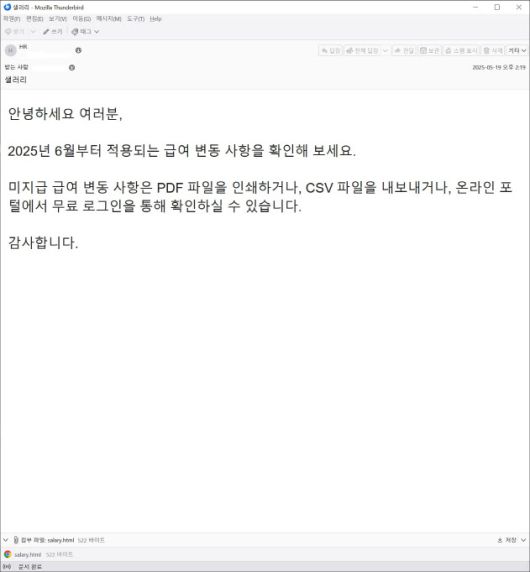 첫번째 사례 속 공격자는 기업 인사 부서를 사칭해 ‘2025년 6월부터 적용되는 급여 변동 사항을 확인’하라는 내용을 담은 메일을 유포했다. 메일 본문에는 ‘급여 변동 사항을 PDF 파일, 온라인 포털 등에서 확인할 수 있다’는 문구와 함께 파일(.html)을 첨부해 사용자의 클릭을 유도했다.