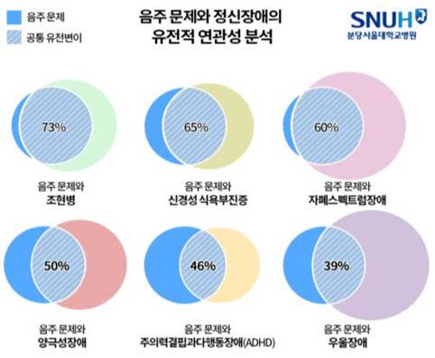 연구 결과 음주 문제와 정신장애는 높은 유전적 연관성을 보였다. 음주 문제가 조현병과는 73%, 신경성식욕부진증과는 65%, 자폐스펙트럼장애와는 60%, 양극성장애와는 50%, 주의력결핍 과다행동장애(ADHD)와는 46%, 우울장애와는 39%의 공통된 유전변이를 공유하는 것으로 나타났다. 이는 음주 문제와 정신장애가 단순히 생활습관이나 환경적 요인을 넘어서 공통된 유전적 기반 위에서 발현될 수 있음을 시사한다.
