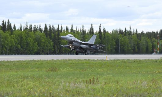 레드플래그 훈련 참가를 위해 공군 충주기지에서 출발한 KF-16이 지난 4일(현지시간) 미국 알래스카주 아일슨 기지에 착륙하고 있다. 공군 제공 |