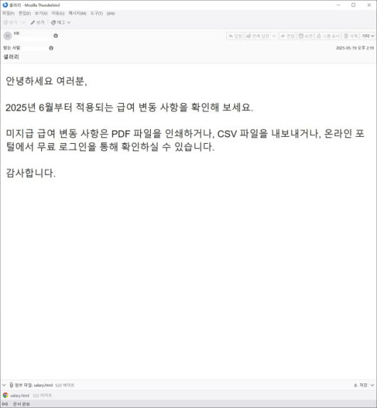 첫 번째 사례 속 공격자는 기업 인사 부서를 사칭해 '2025년 6월부터 적용되는 급여 변동 사항을 확인'하라는 내용의 피싱 메일을 유포했다. 메일 본문에는 '급여 변동 사항을 PDF 파일, 온라인 포털 등에서 확인할 수 있다'는 문구와 함께 '.html' 파일을 첨부해 사용자 클릭을 유도했다.