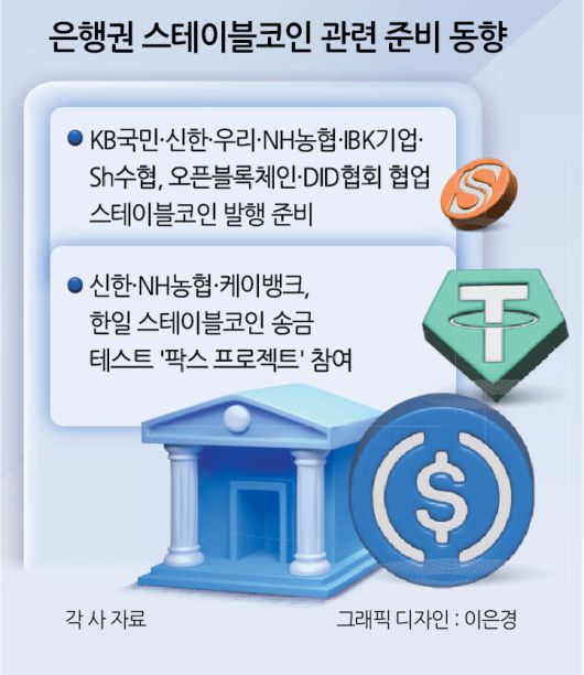 은행권 다른 관계자는 “미국이 추진하는 민간 주도의 자유로운 스테이블코인 발행 방식은 사실상 달러에만 적용 가능한 모델”이라며 “범용성과 수요를 고려해 원화 스테이블코인이 설계돼야 하고 은행 컨소시엄을 통한 스테이블코인 발행이 국내 환경에 적절할 것”이라고 강조했다. 은행들은 스테이블코인 법제화 상황을 예의주시하며 법제화 시 즉각적으로 사업에 뛰어들 수 있도록 준비하고 있다.