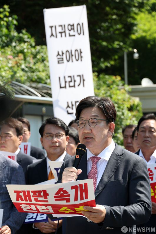 [서울=뉴스핌] 정일구 기자 = 권성동 국민의힘 원내대표가 11일 오전 서울 서초구 서울고등법원 앞에서 열린 헌법 파괴 저지를 위한 현장 의원총회에서 모두발언을 하고 있다. 2025.06.11 mironj19@newspim.com