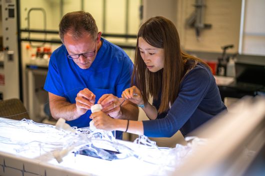 미국 스탠퍼드대 기계공학과의 자오 루이커(오른쪽) 교수와 의대 방사선과 제러미 하이트 교수가 혈관 모사 장치에서 미세 회전장치로 혈전을 제거하는 실험을 하고 있다./미 스탠퍼드대 |