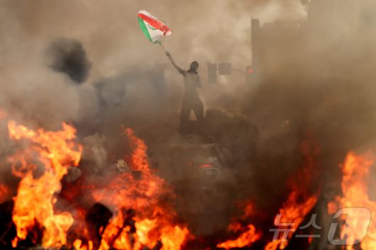 한 남자가 로스앤젤레스 시청 근처에서 연방 이민 단속에 반대하는 시위 중에 연기가 나고 불길이 치솟는 차량 옆에서 멕시코 국기를 흔들고 있다. 2025.6.8 ⓒ 로이터=뉴스1 ⓒ News1 강민경 기자 |