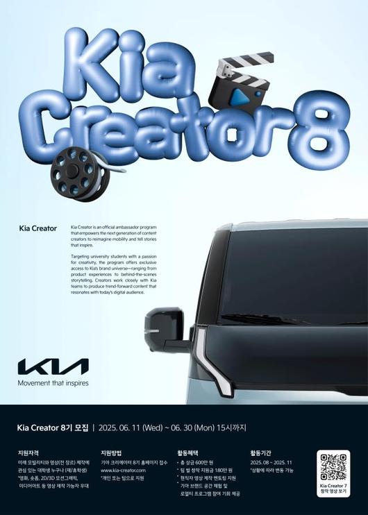 기아 크리에이터 8기는 미래 모빌리티와 영상 제작에 관심이 있는 대학생 누구나 참여할 수 있으며 오는 8월부터 11월까지 4개월간 다양한 창작 활동과 브랜드 체험이 이뤄진다.