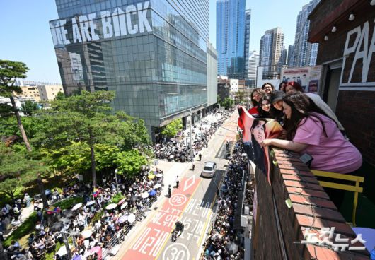 방탄소년단 멤버 RM과 뷔가 어제(10일) 전역한데 이어 지민과 정국이 11일 군 복무를 마치고 전역한 가운데 서울 용산구 하이브 사옥 앞에서 국내외 아미(ARMY·BTS의 팬덤)들이 멤버들의 전역을 축하하고 있다.