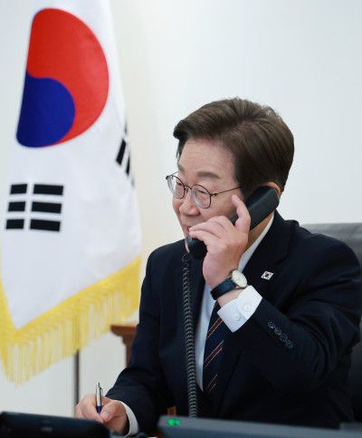 이재명 대통령이 9일 서울 용산 대통령실 청사 집무실에서 이시바 시게루 일본 총리와 전화 통화를 위해 수화기를 들고 있다. 2025.6.9 |