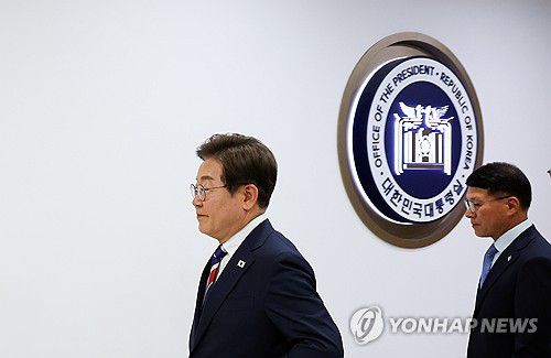 (서울=연합뉴스) 한상균 기자 = 이재명 대통령이 11일 서울 용산 대통령실 기자식당에서 출입기자들과 점심식사 후 이동하고 있다. 오른쪽은 황인권 대통령경호처장. 2025.6.11 [대통령통신사진기자단]