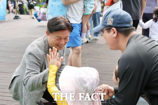 조용익 부천시장이 지난 7일 중앙공원 물놀이장 개장식에서 어린이들과 하이파이브를 하고 있다./부천시 |