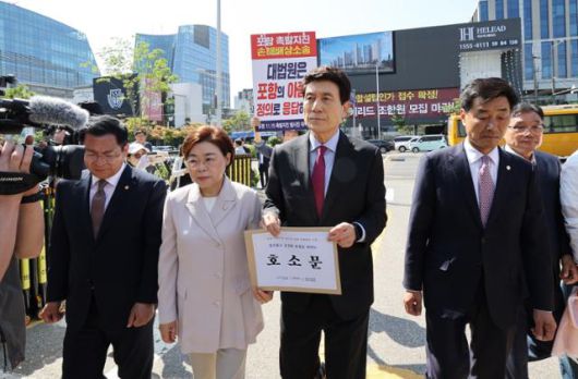 이강덕 포항시장을 비롯해 김일만 포항시의회 의장, 김정재·이상휘 국회의원은 서울 서초동 대법원을 방문해 포항 지진 위자료 소송과 관련해 호소문을 제출하고 있다. 포항시 제공 |
