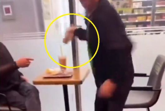 영상에서는 카페에서 모자를 쓴 노인이 일어서서 촬영자와 일행에게 “야”라고 소리치더니 자신의 음료수를 힘껏 던지는 모습이 포착됐다.