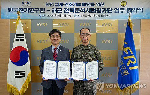 (창원=연합뉴스) 이정훈 기자 = 한국전기연구원과 해군 전력분석시험평가단은 11일 경남 창원시 전기연구원 본원에서 차세대 함정 전동화 기술개발 업무협약을 체결했다.