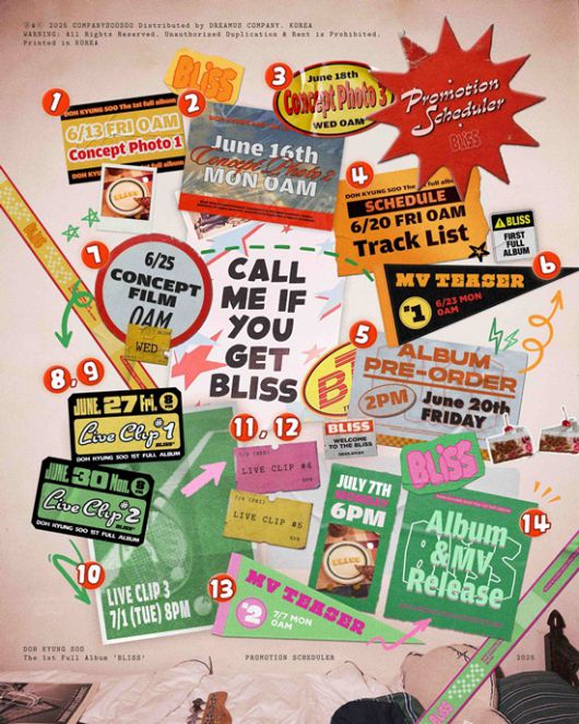 지난 9일 첫 번째 정규 앨범 ‘BLISS(블리스)’의 프롤로그 영상으로 컴백을 알린 도경수가 11일 공식 SNS에 프로모션 스케줄러를 선보이며 본격적인 컴백 예열에 나섰다.