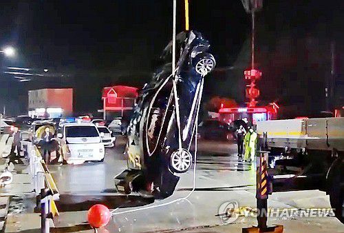 일가족 탑승 차량 인양하는 해경 |