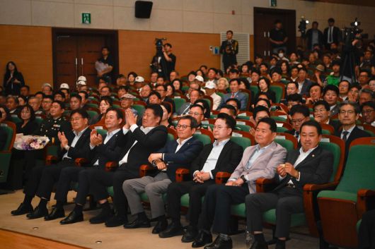 육동한 시장은 도내 18개 시군 시장·군수, 도지사, 국회의원들과 함께 화합 퍼포먼스에 참여해 지역 간 상생과 협력을 다짐하는 시간을 가졌다.