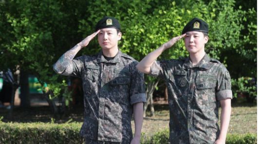 육군 현역 복무를 마치고 만기 전역한 그룹 방탄소년단(BTS)의 지민(오른쪽)과 정국이 11일 경기도 연천군 연천공설운동장에서 거수경례를 하고 있다. (사진=연합뉴스) |