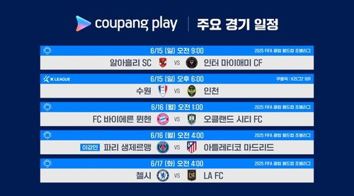 (서울=연합뉴스) 이정현 기자 = 쿠팡플레이는 오는 15일부터 2025 국제축구연맹(FIFA) 클럽월드컵을 선택형 부가 서비스인 '스포츠 패스(PASS)' 콘텐츠로 중계한다고 11일 밝혔다.