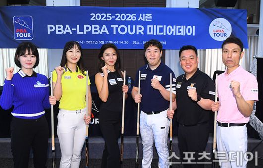 [스포츠투데이 팽현준 기자] 11일 서울 중구 한국프레스센터 프레스클럽에서 열린 2025-2026시즌 PBA-LPBA 투어 미디어데이에서 서한솔 김상아 김가영 강동궁 조재호 최원준이 기념촬영을 하고 있다. 2025.06.11. [스포츠투데이 팽현준 기자 sports@stoo.com]