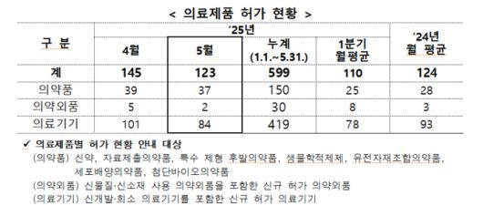 올해 누적 의료제품 허가 수는 599개를 기록했다. 5월까지 월평균 허가 품목 수는 119.8개로 지난해 월평균 124개에 비해 소폭 적은 수준이다.