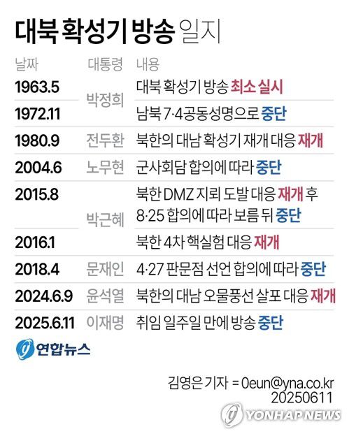 대북 확성기 방송은 지난해 6월 윤석열 정부가 6년 만에 재개를 결정했고, 이번에 재개 1년만에 중지됐다.